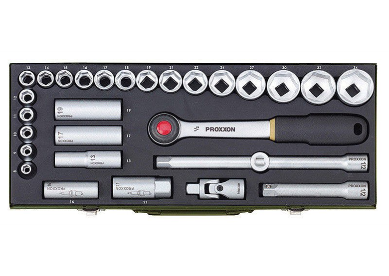 Jeu de douilles 1/2 "jusqu'à 34 mm, (M22 avec la nouvelle norme ISO). Douilles profondes, pour vis à filetage en saillie. Douilles pour bougies d'allumage de 16 et 21 mm. Boîtier métallique très stable, peint par poudrage, avec insert en plastique embouti .